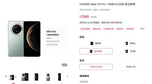 华为Mate 70 Pro+:原价8499元起,优惠1000元,到手价7499元起;